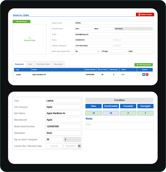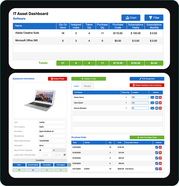 Track serial numbers, qty on hand/remaining, purchase orders, conditions (New/Good/Unusable/Damaged), warranties, and assign to users.